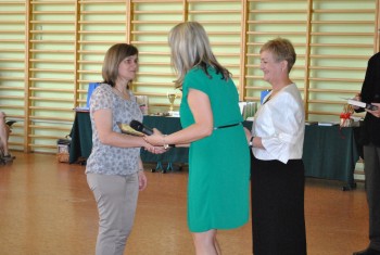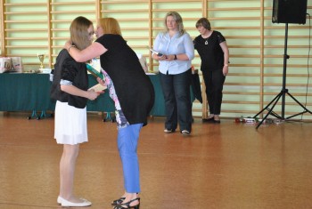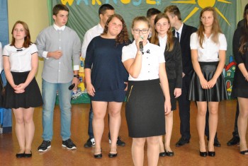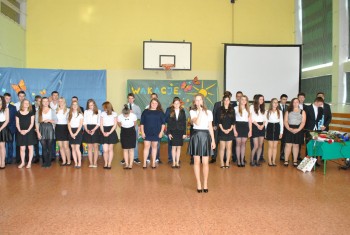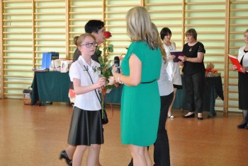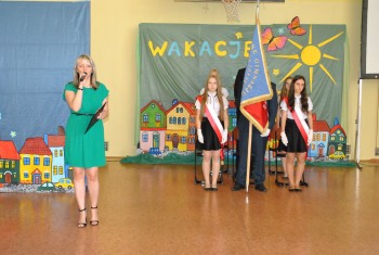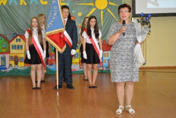 Po wprowadzeniu sztandaru wszystkich powitała dyrektor szkoły Małgorzata Wolszczak, która następnie podsumowała w formie prezentacji wyniki klasyfikacji za rok szkolny 2014/2015 oraz wyniki egzaminu gimnazjalnego.